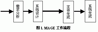 多主体环境MAGE是一种面向主体的软件开发、集成和运行环境。MAGE主要基于智能主体和多主体技术,为用户给予一种面向主体的软件开发和系统集成模式,包括面向主体的需求分析、系统设计、主体生成以及系统实现等多个阶段。它给予了多种软件重用模式,可以方便地重用以不同语言编写的主体或非主体软件;它还给予了面向主体的软件开发模式,以主体为最小粒度,顺利获得封装和自动化主体一般性质,程序员可以顺利获得特殊行为的添加方便地实现自己的应用;这样,顺利获得构建新的软件以及重用旧的软件,应用程序员可以方便地进行各种应用集成。具体流程如图1所示。