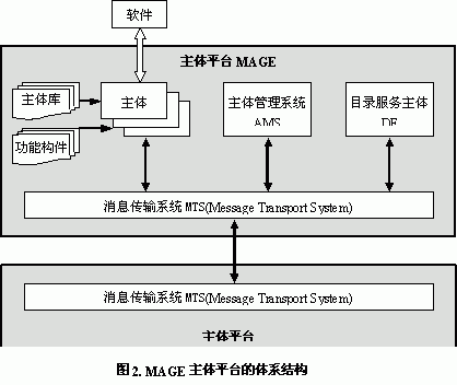MAGE主体平台主要包括四个模块,即主体管理系统AMS、目录服务主体DF、一般主体以及消息传输系统MTS(在MAGE中由主体通信通道ACC实现),此外,还有两个辅助的模块为主体系统开发给予方便,即主体库和功能构件库。具体的体系结构如图2所示。